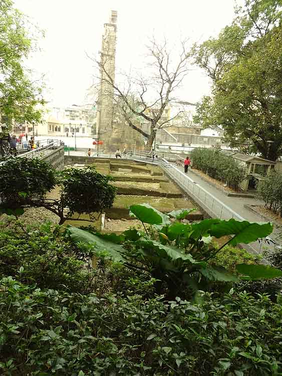 遺跡東側より。奥に聖ポール天主堂が見えます。赤い服のおばさんが歩いているところはコレジオの南翼廊下部分と思われる場所です。
