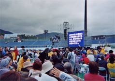 会場のビッグNスタジアムは平和公園の近くにありました。「ペトロ岐部と187殉教者列福式」の横断幕がかかり、人々も集まってきています。こんなに早く来ても誰もいないだろう、と高をくくっていた私。甘く見ていた。じろーさんは、雨の中ユミさんたちと連絡を取って下さっている。何から何までお世話になり、大変ありがたい方々です。合流までの間、2人でキョロキョロしていると、何か話しかけられた。