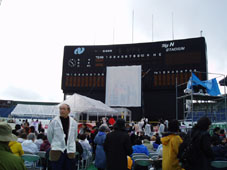 普段グラウンドの場所には緑色のビニールシートが敷きつめられ、電光掲示板の下に舞台(内陣)が出来上がっていて、左右に大きな画面が設置されています。私はグラウンドには舞台しかないのかと思っていたけど、そこにもパイプ椅子がずらっと並べられ、座れるようになっていた。なるべく前の方に行ったら、一番前のブロックに座れた!「早起きは三文の得」だね。