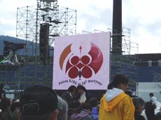 ユミさんたちは、私たちの分までレインコートを用意しておいて下さいました。なんともありがたい…どうもありがとうございます。そしてカバンを入れるビニール袋まで…いやはや、どこまで気がまわる方たちなのでしょう。私は傘があればいいか、くらいにしか考えてなかったというのに。ありがたくレインコートを着て、会場内に入ることに。ユミさんからワッペンをいただき(例の、持ってないと入れないワッペン)、名前を書いて首にかける。ユミさんは名前を書くペンまで貸してくださいました。本当に何から何まで…どうもありがとうございます。