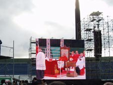 舞台脇の大画面。映っているのは列福式のマーク |