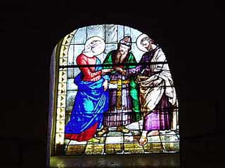 この教会には地下があり、ヨセフにまつわるステンドグラスが設置されていました。まずはヨセフとマリアの結婚 |