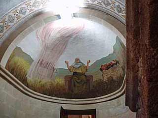 エリヤの部屋にある絵。エリヤは紀元前9世紀くらいのイスラエルの預言者で、イスラエルの神ではないバアル神を信仰する人たちと対決しました。この絵はそのときの対決で、神の火がエリヤの捧げものに下ってきたときの様子を描いています。…実はここ、天井にヤモリがいて気をとられ、説明メモをあまりとってない(^^;) |