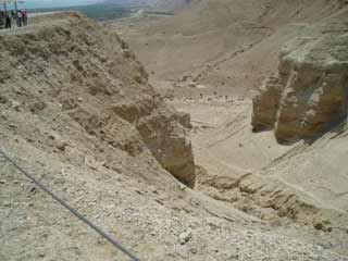死海を背にして立つと、「死海写本」が発見された洞窟が見えます。岩山の中腹に穴があり、今は谷をはさんで反対側の山からの見学のみになっています。