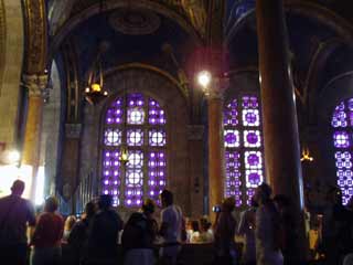 祭壇のわきでミサを見学。十字のステンドグラス、内部では紫色になってました。とてもきれい |