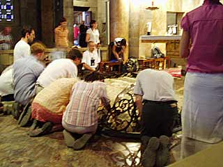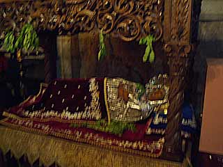 天井からランプやら何やらがいろいろ吊るされています。マリアの墓石がある所は小さなお家みたいになっています。右の人が身をかがめてますが、墓石への入口があります |