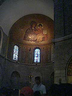 同じくシオンの丘にあるマリア永眠教会は、マリアが眠りについた場所を記念する教会で、ベネディクト修道会が管理しています。地下にはマリアが眠っている木彫像があり、まわりの小さな祭壇(?)はそれぞれの国のベネディクト会が作ったものだそうです。赤・黒・白といった色合いの個性的なモザイクで飾られたものもありました。アフリカかどこかの国だったかな…??このあたりでデジカメの電池が切れたため、携帯電話の悪い画像になっております…