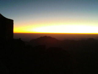 日暮れと同時にデジカメの電池がまたもやなくなり、しかも充電器がトランクの中という大失態をやらかしつつ、今夜のホテルへ。生活水用で2リットルのミネラルウォーターが配給された。エジプトの水道水は細菌が入っているとかで、日本人は飲まない方がいいらしい。イスラエルの水は石灰分が多いので、飲んでもいいけど人によっては…という事情だったけど、エジプトはさらに危険。夕飯にはおいしそうな果物が出たけど、それも危険ということで私はパンとスープのみ(実はお腹が全く空かない状態がずっと続いていたので)。 夕飯が終わり、友人と二人でシャワーをどうするか相談。結果、ミネラルウォーターを浴びようということになった。それだけでなく、うがいも、顔を洗うときも、コンタクトを入れるときも、全てミネラルウォーターを使用。2リットルもらっておいてよかった。 さて、次の日はシナイ山頂上でご来光を見るという予定のため、10時就寝、12時半起床という鬼なスケジュール。なんか気が張ってるのでウトウトしただけですぐ起床になってしまった。 夜中1時にロビーに集合し、バスで登山口へ。登山口には他の登山グループも集まっていた。みんなご来光を狙っているのだろう。 ぼちぼち歩きだし、登山開始。最初は平坦な砂利道なので、私でも余裕。懐中電灯を持ってくるように言われてたけど、月明かりがあるので、目が慣れれば必要ない。近くの岩山に月明かりが当たって岩肌が浮き上がっている。小さいころ、絵本か何かでこんな風景を見たなあ。これ、カメラで撮っても写らないんだろうなあ。そんなことを考えながら歩いていると、だんだん登り坂がきつくなってきた。 「ラクタ、ラクタ。camel, camel 」と言いながらついてくるベドウィンのオジサンたちが、いつのまにかまわりにいる。ラクダを連れて歩き、疲れた登山者を狙って、ラクダに乗せて歩くのだ。日本語を知ってるあたり、日本人は利用する人が多いんだろうな。同じツアーで来ていた足の悪いおじさんは無理せずラクダを利用していた。ちょっといいなあ…しかし体力ゼロとはいえ、特に具合の悪くない私は、ラクダの誘惑を乗り越える。料金も貧乏学生にとっては高かった(たぶん30ドルくらい)。 道はさらに急になり、ラクダも歩けないような岩山になると、ベドウィンのオジサンたちは消えた。いよいよ自分で歩かないといけない。休憩をちょこちょこはさみつつ、さらに登る。 頂上付近は、岩がゴロゴロ。次の一歩でどこに足を置いたらいいのかわからないので、前の人が登っている通りにする。同じツアーの人がもういないし。みんな体力あるんだなあ…遅れた私には添乗員さんがついててくれたので、最後まで無事に登りきりました!! もう日の出に間に合わないと思っていたが、まだ大丈夫だった。友人がいい場所をとっておいてくれたので、隣におさまる。デジカメの電池が切れたので、携帯電話のカメラ片手に日の出を待つ。