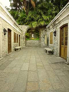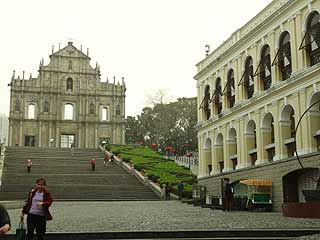 遺跡の解説板には、ポルトガル語・中国語・英語が併記されていた。やっぱり漢字に目が行ってしまうので中国語から。「なになに、『通往閲讀室和其他工作間』…???」何かの部屋?わからないので英語へ。『Access to the study and service support areas of the College』………え???カレッジ!?まさか!最後にポルトガル語へ。ポル語はやってないのでよくわからないのだが、少しかじったスペイン語力でがんばってみる。すると、最後に『Colegio』と書いてあった。………三か国語を3回くらい読み返したが、これって、コレジオだよね…?という結論に至った。そういえば、『地球の歩き方』の隅っこに、そんなようなことが書いてあったような…?しかしこんなに大きいとは思わず、「壁の一部が見つかった」程度にしか読み取っていなかった。いや〜〜、来てみないとわからないことって多いですね(これも上記の「天上の青」様に載っていました。ただの予習不足)。
