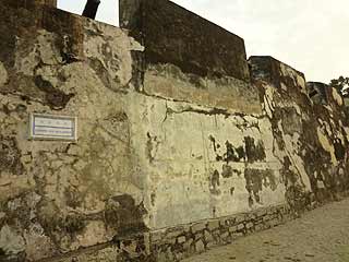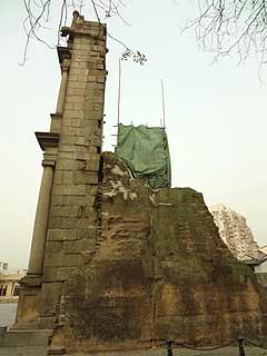 〜早すぎた〜 あれ?これ、反対側には行けないんだっけ?と思い、天主堂壁の真ん中入り口に近づいてみると、金網のシャッターで入れないようになっていて、立て札に9時からって書いてある。そうか、ここから先は博物館で入れなくなってるんだ。またあとで来るつもりだったのでまあいいや。ということで、聖ポール天主堂のまわりをウロウロ。 〜ウロウロしてたら着いた〜
