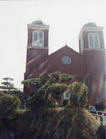 それから浦上天主堂の遺壁と原爆当時の地層も見ました。お茶碗が埋まってた。これも使ってた人がいたんだよなあ。原爆落下中心地は、あの日のことはまるで嘘のようにおだやかだった。トンビが鳴いてた。この上空500メートルのところで核が爆発したそうです。空を見てボーッ。車なんかブーブー走っちゃって、今は平和なんだ、本当に。平和の泉の噴水には虹が出てました。 〜コギャル怖い〜 〜浦上天主堂でミサに参加〜