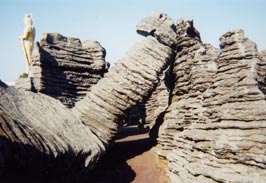 すごい、観音様!ピカピカしてる!でかい!見上げて「はあ〜」とため息。観音様のもとからは、東シナ海が見えました。次は化石の森へ。誰もいないのをいいことに、縦横無尽に歩き回る。すごい迫力。日本一の石灰藻化石群だそうです。なんか違う世界みたい。思う存分異世界を満喫したあとは、七福神と十二支本尊の霊場へ。ここは七福神と十二支の守り本尊の像がぐるっと円状に配置されています。私の守り本尊は阿弥陀如来…だったかな、たぶん(よく覚えてないのだ)。花壇にパンジーがたくさん咲いててきれいだった。お気に入りはお不動さまの像と水子観音様です。イヤ、気に入られても…。近くにあった鐘を好奇心だけで思いっきり鳴らし、移動。こんな不謹慎な者は来ちゃイカンな。