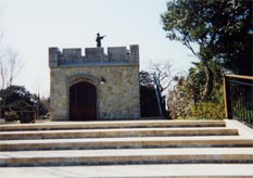 細い道の前で、車は止まりました。とうとう来たんだわ、ジュリアンの生まれた土地へ!その道を歩いていくと、小さな公園がありました。まだ整備されたばかりでとってもきれい。塀に「ジュリアン記念公園」と書かれたタイルが埋め込まれてました。そして前方にはジュリアンの像が!小さな建物(資料館)の上に、海の方を指さす少年が立ってます。登ってみると、海がよく見えました。ジュリアンを見上げると、まぶしくてよく見えなかった。いろんな意味で。