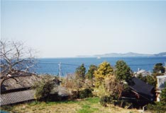 おばちゃんによると、仕事で泊まりにくる方はけっこういらっしゃるようですが、私みたいなのはめずらしいらしく「どこを見にいらしたのですか?」と優しく尋ねられました。「釜蓋(かまぶた)城ってありますよね」と言うと、「ああ、釜蓋城ですか。ここから見えますよ」と、廊下の窓を開けて見せてくれました。山の上に、白い建物が小さく見える。すごい、ここから見えるのか!「あ、あれですか!すごいですねぇ!」とはしゃぎだした私。ついでに「ここから海には行けますか?」と訊いてみる。おばちゃんに海への道を教えてもらい、早速でかけようとしたが、まだ日が高い。あわよくば夕日を見ようとしていた私は、もう少し休んでから行くことにした。